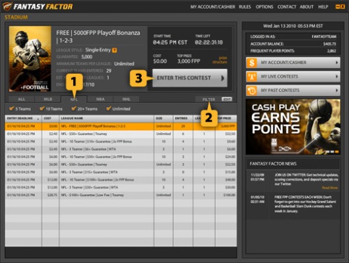 The FantasyFactor.com's desktop app let you play daily fantasy sports contests for free of for real cash prizes. FantasyFactor provides one-day fantasy sports contests featuring individual professional sports games like hockey, football, basketball or baseball, available in varying league sizes (from three players sit-and-go to large tournaments) and price points.